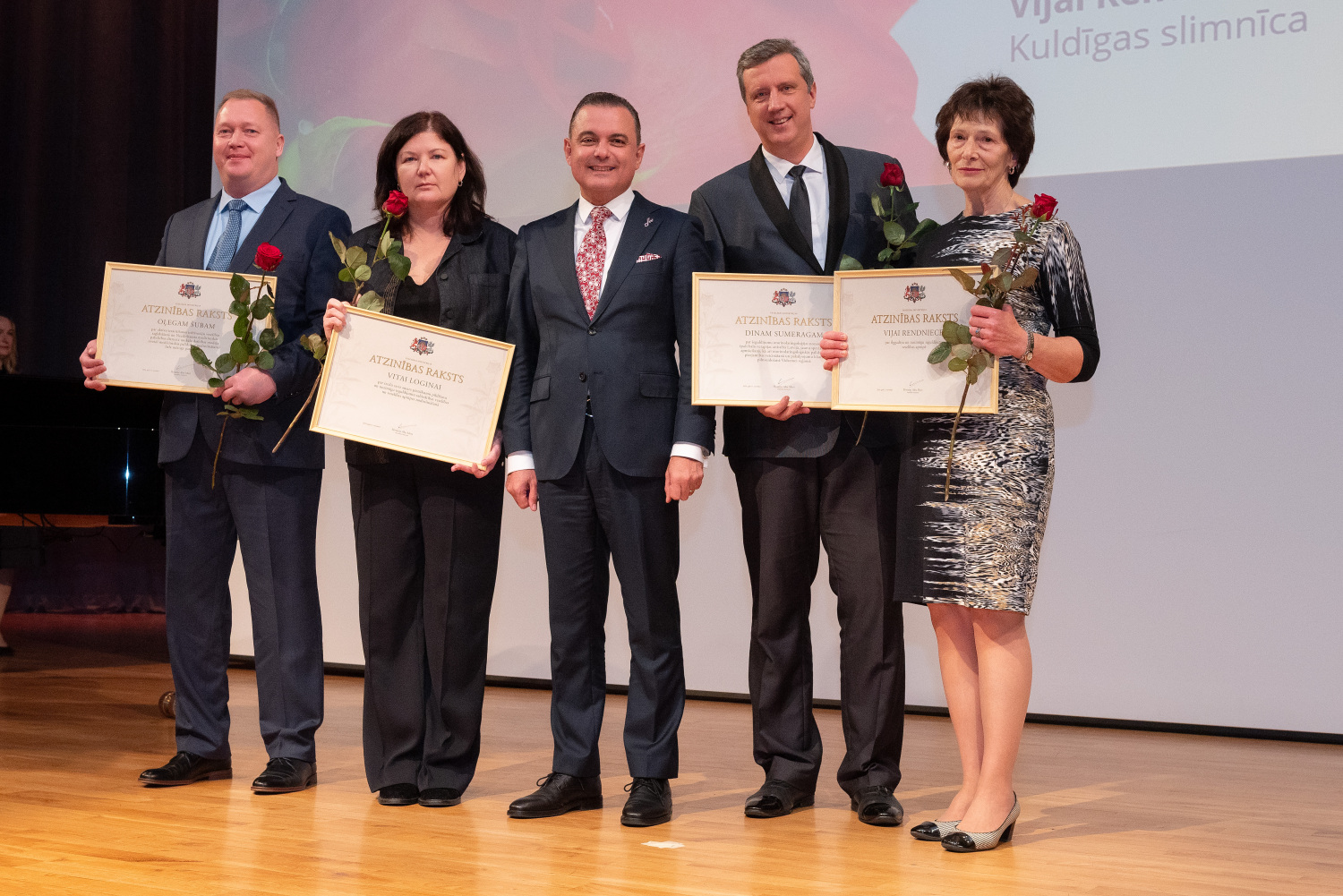 Veselības ministrijas apbalvojums – Atzinības raksts tika pasniegts 62 nozares profesionāļiem. Starp augstā apbalvojuma saņēmējiem bija arī Kuldīgas slimnīcas Iekšķīgo slimību nodaļas vadītāja, interniste, pneimonoloģe Vija Rendniece un Neatliekamās medicīniskās palīdzības un pacientu uzņemšanas nodaļas dežūrārste Jeļena Mjasņikova.