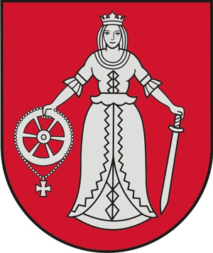 Heraldiskais apraksts – „Sarkanā laukā sudraba jaunava – Sv.Katrīna – ar kroni; labajā rokā tāds pats rats ar tam piekārtu krustiņu, kreisajā – lejupvērsts zobens; sudraba izrobota šaurapmale”.
