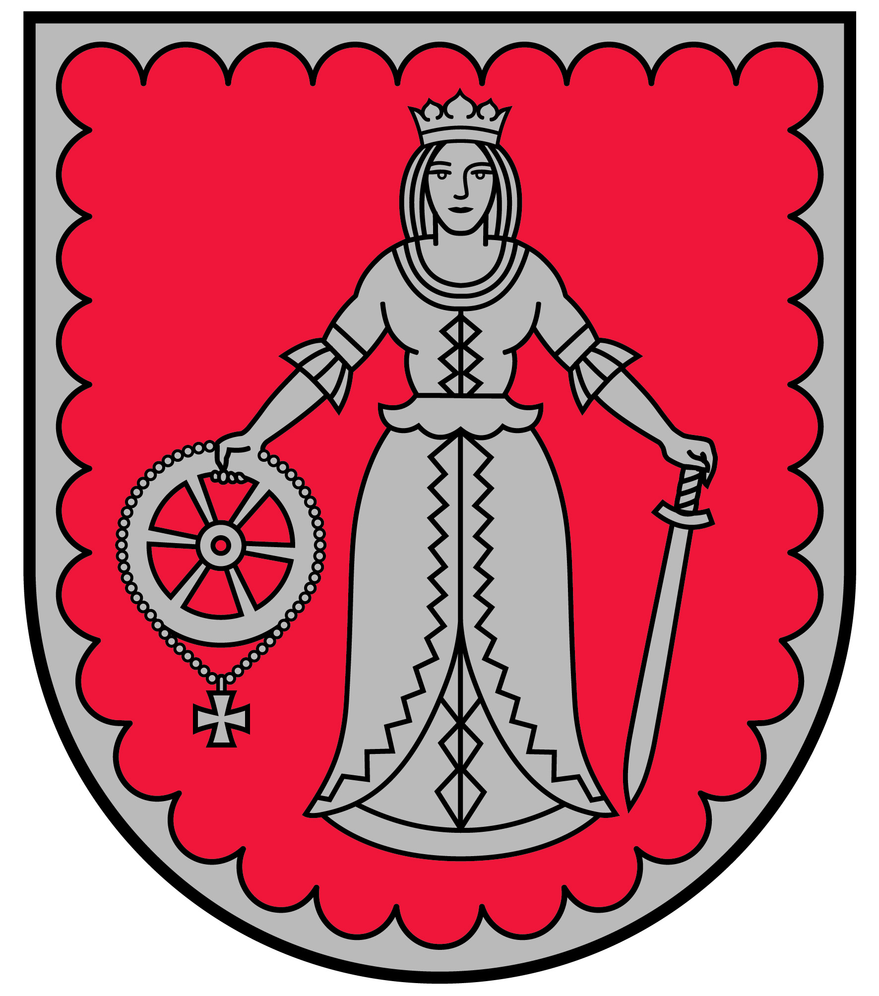 Heraldiskais apraksts – „Sarkanā laukā sudraba jaunava – Sv.Katrīna – ar kroni; labajā rokā tāds pats rats ar tam piekārtu krustiņu, kreisajā – lejupvērsts zobens; sudraba izrobota šaurapmale”.
