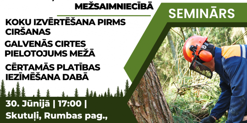 Meža konsultāciju pakalpojumu centrs piedāvā BEZMAKSAS semināru par Meža kopšanas cirtes, galvenās cirtes, izlases cirtes, sanitārās cirtes pielietošana mežsaimniecībā.