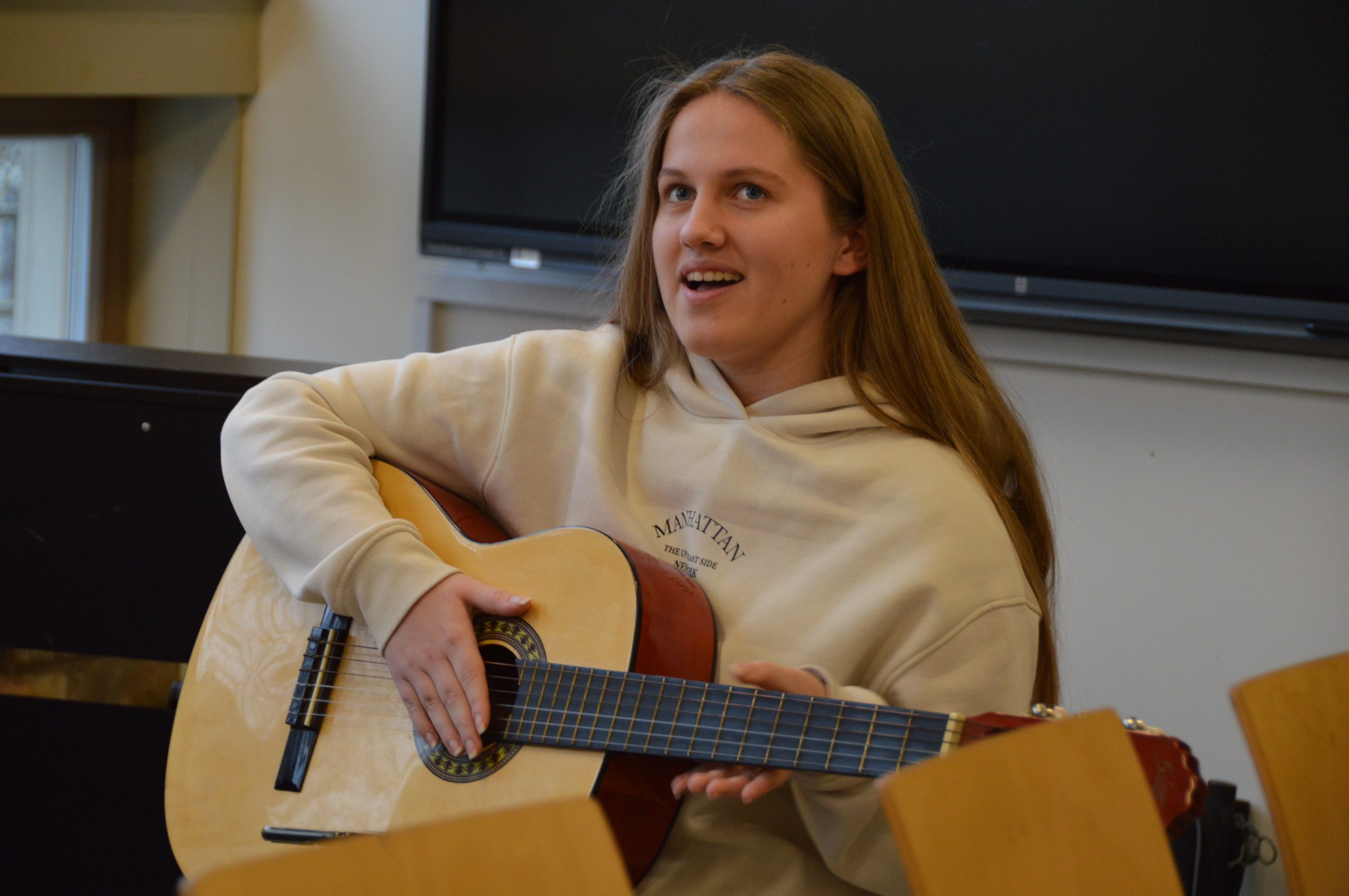 Deputātus uzņēma skolēnu pašpārvaldes pārstāvji, bet muzikālu sveicienu bija sagādājusi 12.klases skolniece Ance Lagzdiņa, kura spēlēja pašas sacerētu dziesmu.