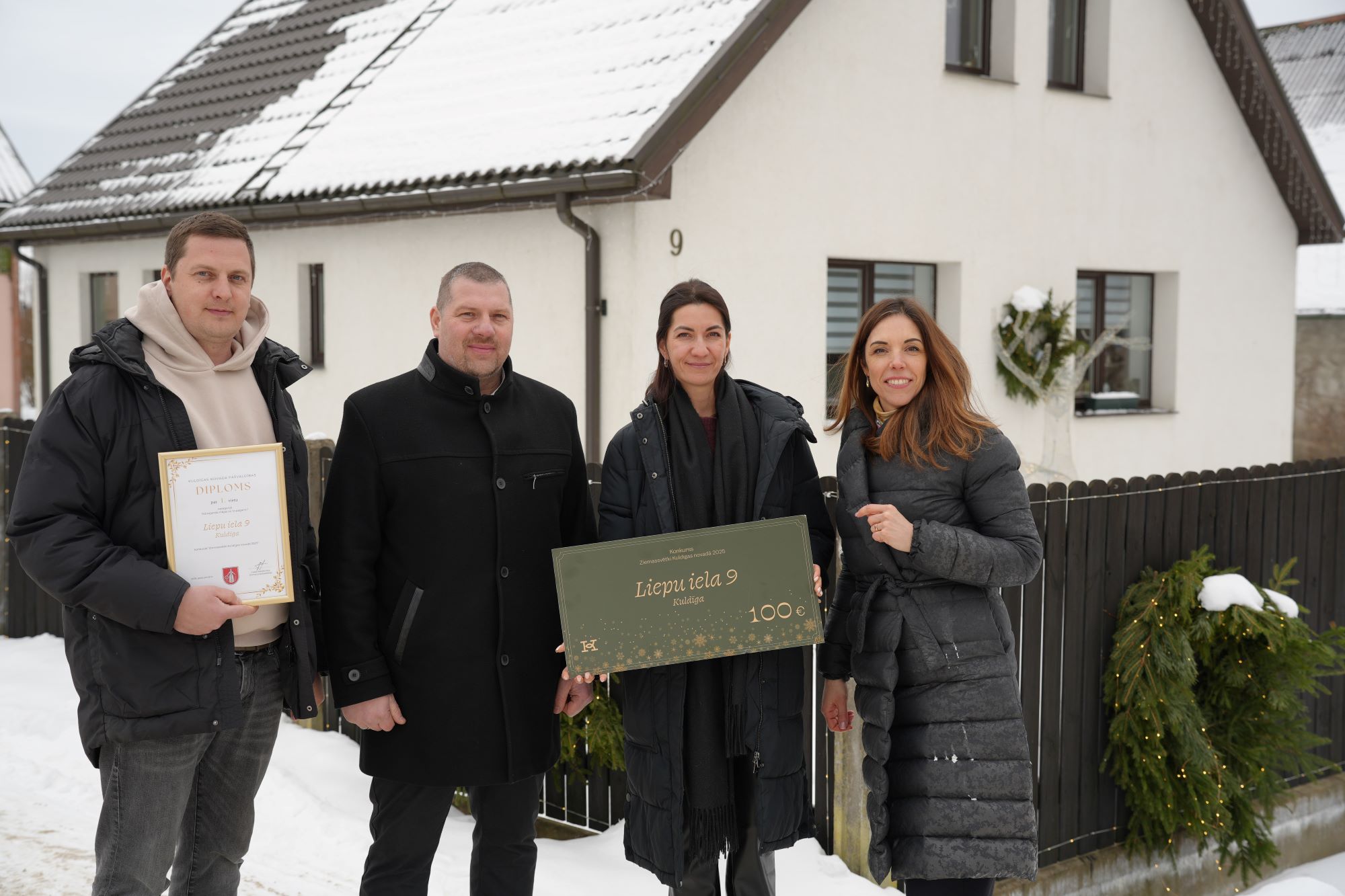 Noslēdzies konkurss “Ziemassvētki Kuldīgas novadā 2025”, kurā iedzīvotāji, uzņēmēji un iestādes tika aicināti iesaistīties svētku noskaņas radīšanā, izrotājot savus īpašumus un piesakot tos konkursam. Kuldīgas novada domes priekšsēdētājas vietnieks Artis Roberts un izpilddirektora vietniece Agnese Buka labāko noformējumu autorus godināja personīgi, sveicot ar Atzinības rakstu un naudas balvu un pateicās par radošumu un ieguldījumu novada rotāšanā.